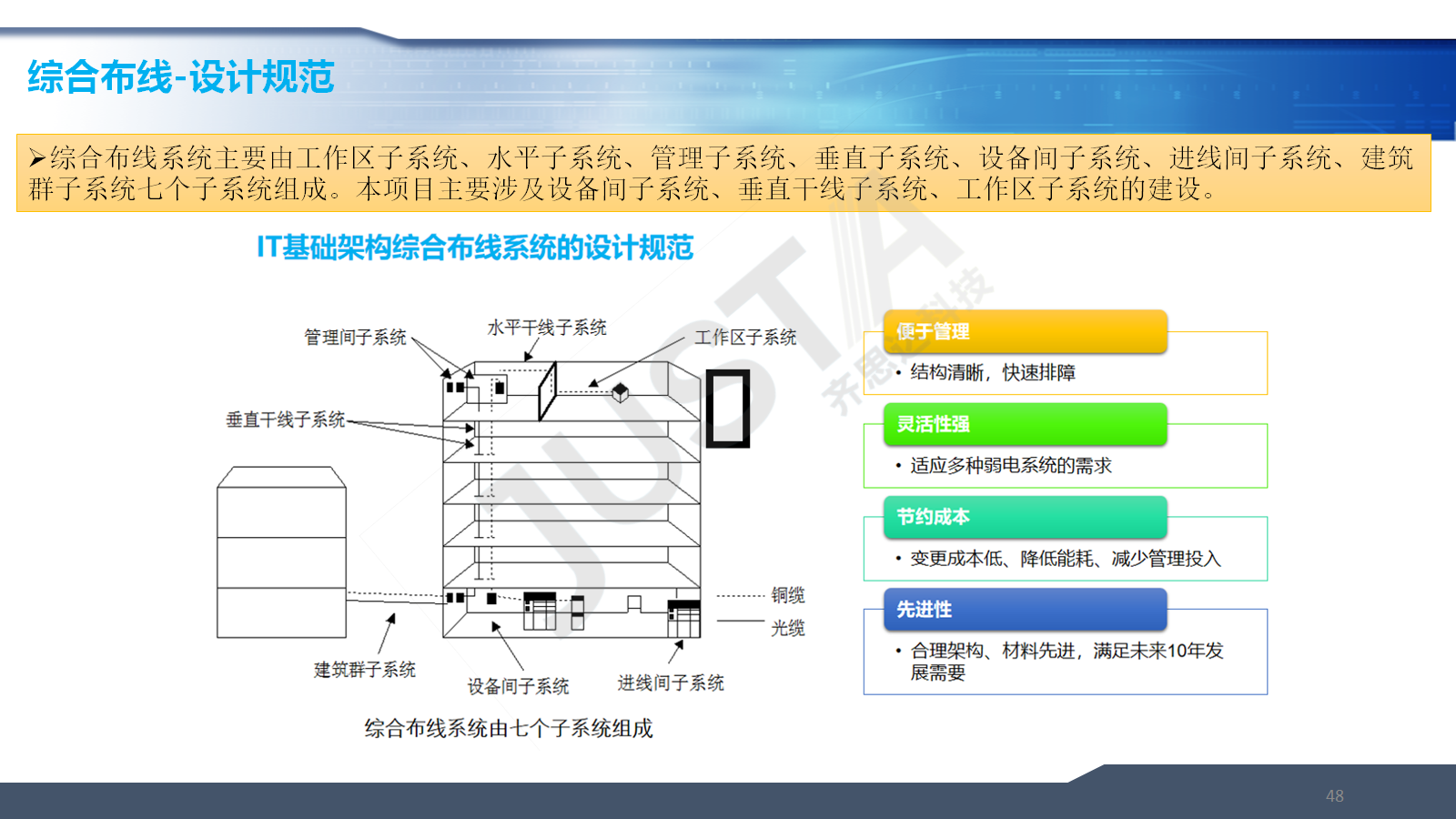 严格按照结构化综合布线七个子系统的要求和标准进行施工,包括工作区子系统、水平子系统、管理子系统、垂直子系统、设备间子系统、进线间子系统和建筑群子系统。
