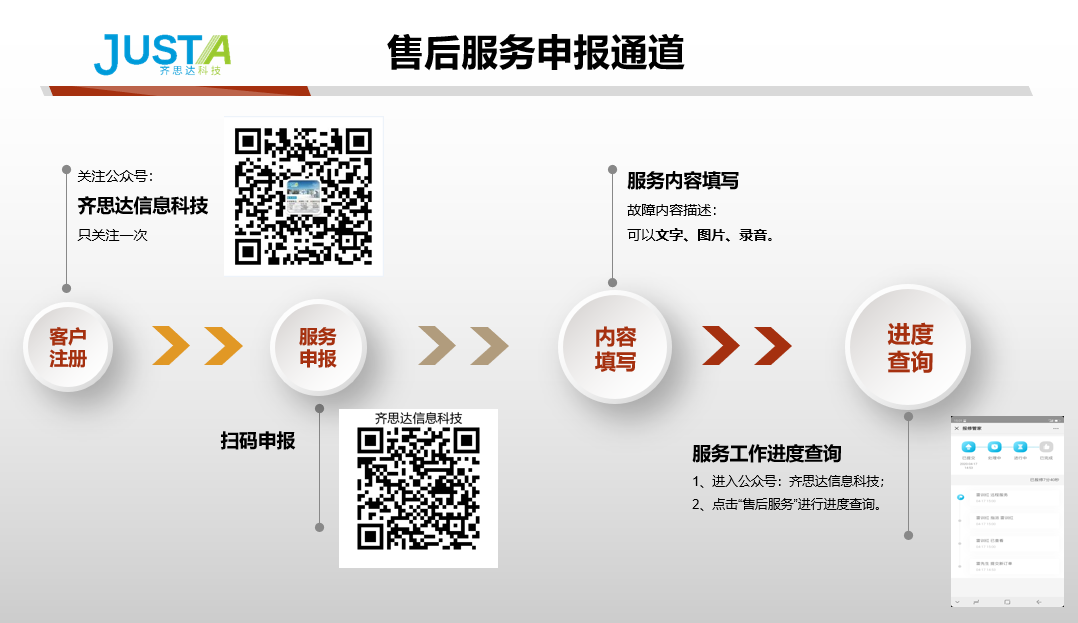 客户可通过公众号、热线电话(180-2597-9272)、邮箱(sw03@qisida.com.cn)等多渠道申报故障;7×24小时热线与远程服务快速响应,8:00-18:00 期间4小时内、其余时段6小时内工程师到达现场,并在到达现场后4小时内排除故障。如硬件故障在检修8小时后无法解决,则提供一站式厂家对接服务。