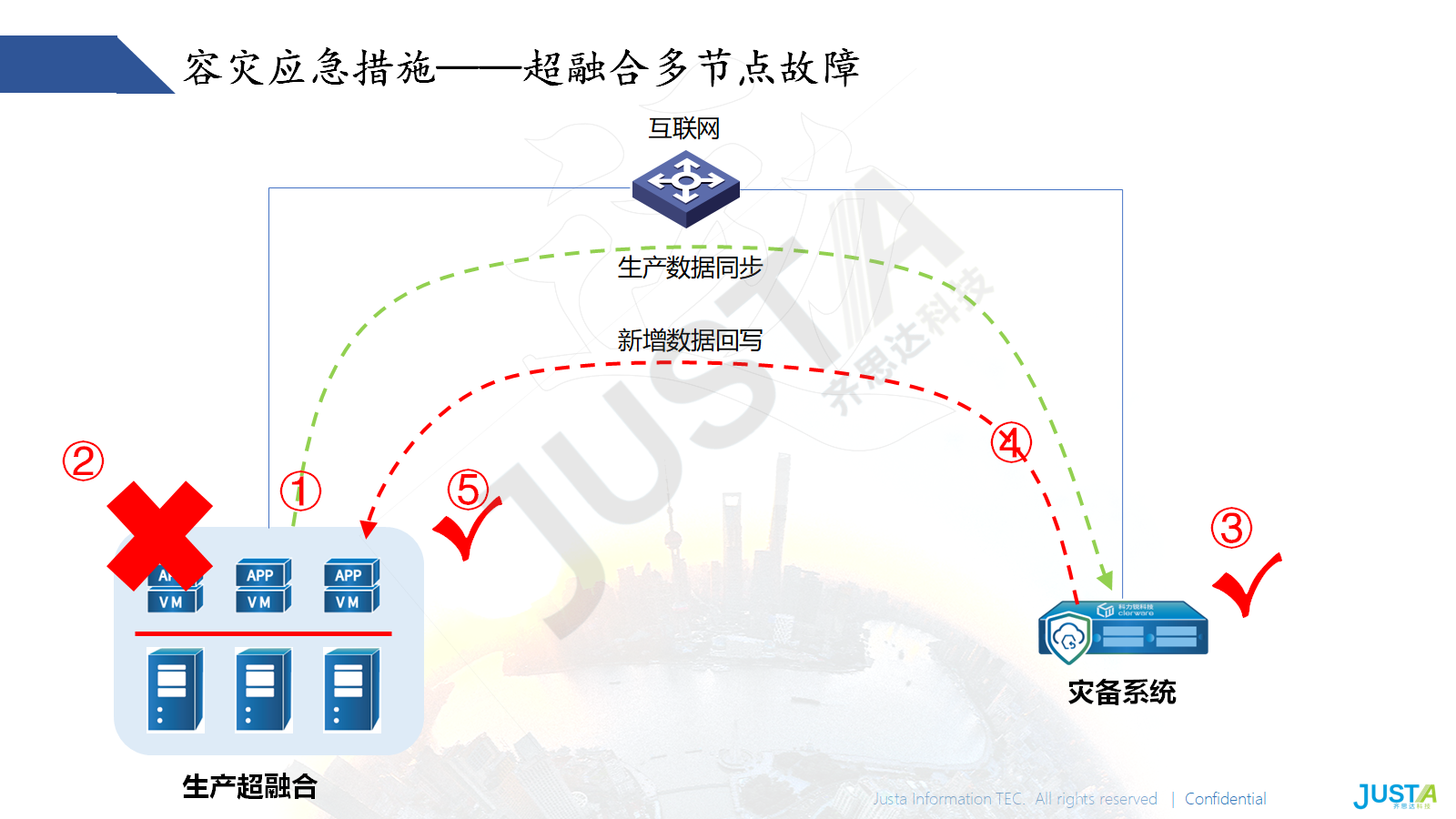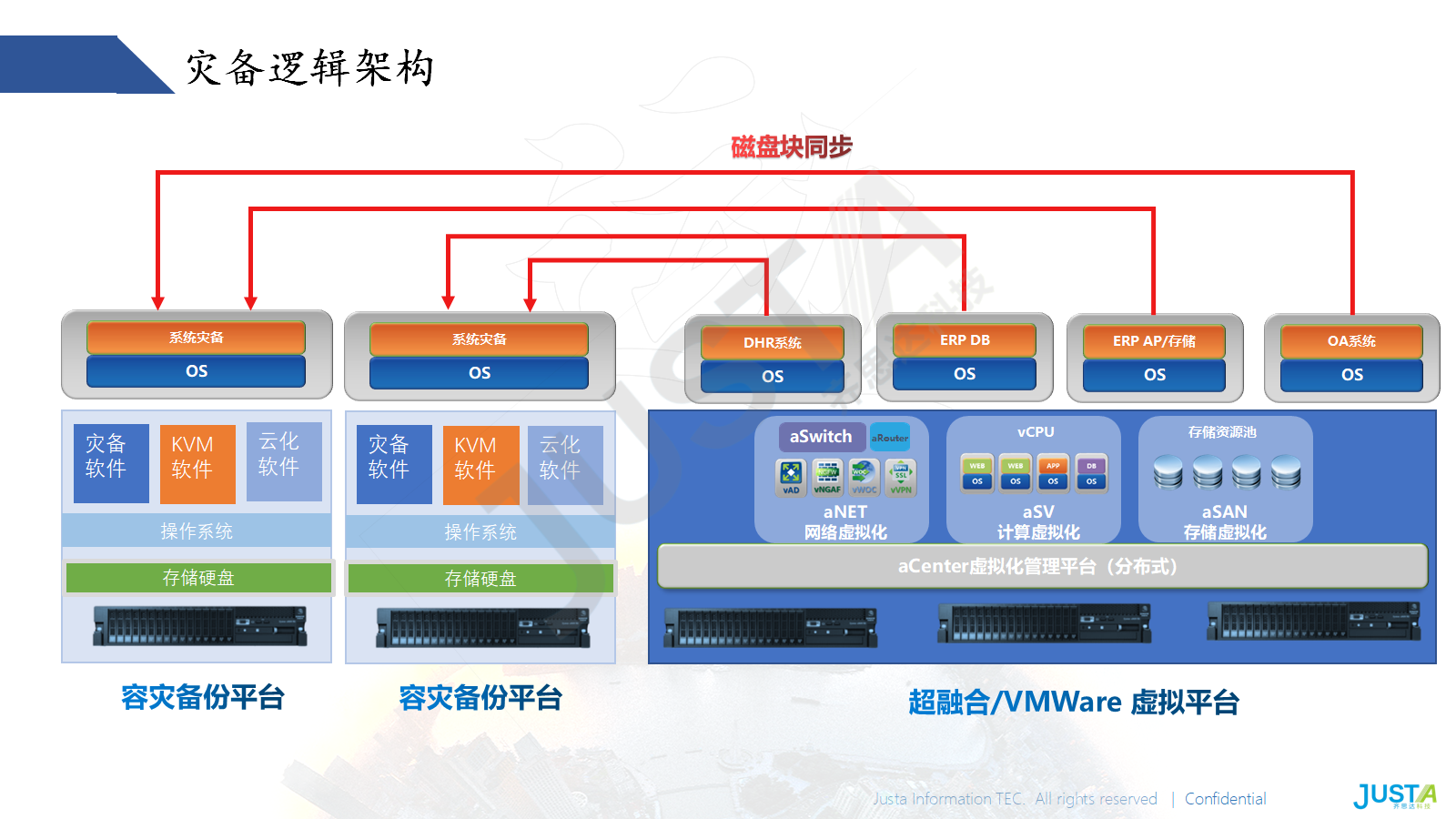 在数据中心区域部署1套业务灾备系统,实时同步核心应用及其数据。当超融合平台宕机时,灾备系统可临时接管应用系统,实现RTO≤15分钟,RPO(恢复点目标)≈0的效果。
