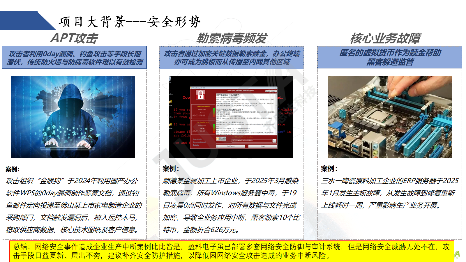 近年网络攻击事件频发:佛山某家电企业遭 “金眼狗” 组织利用 WPS 0day 漏洞窃取核心数据,顺德某金属加工企业因勒索病毒支付 626 万元赎金,此类案例为盈科电子敲响警钟。