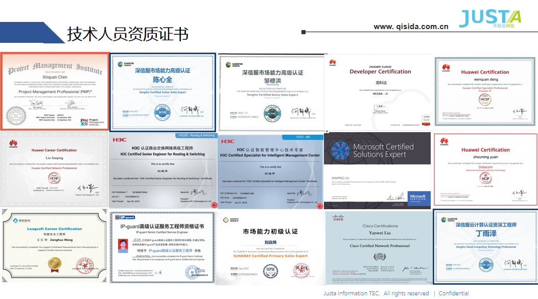团队成员拥有20年外资集团合作经验,参与过 ISO27001 信息安全体系建设。目前公司也已通过 ISO27001 认证、CS1 信息系统建设和服务能力认证、高新技术企业认证等,技术人员持有深信服、华为、Cisco 等厂商中高级认证,专业实力过硬。