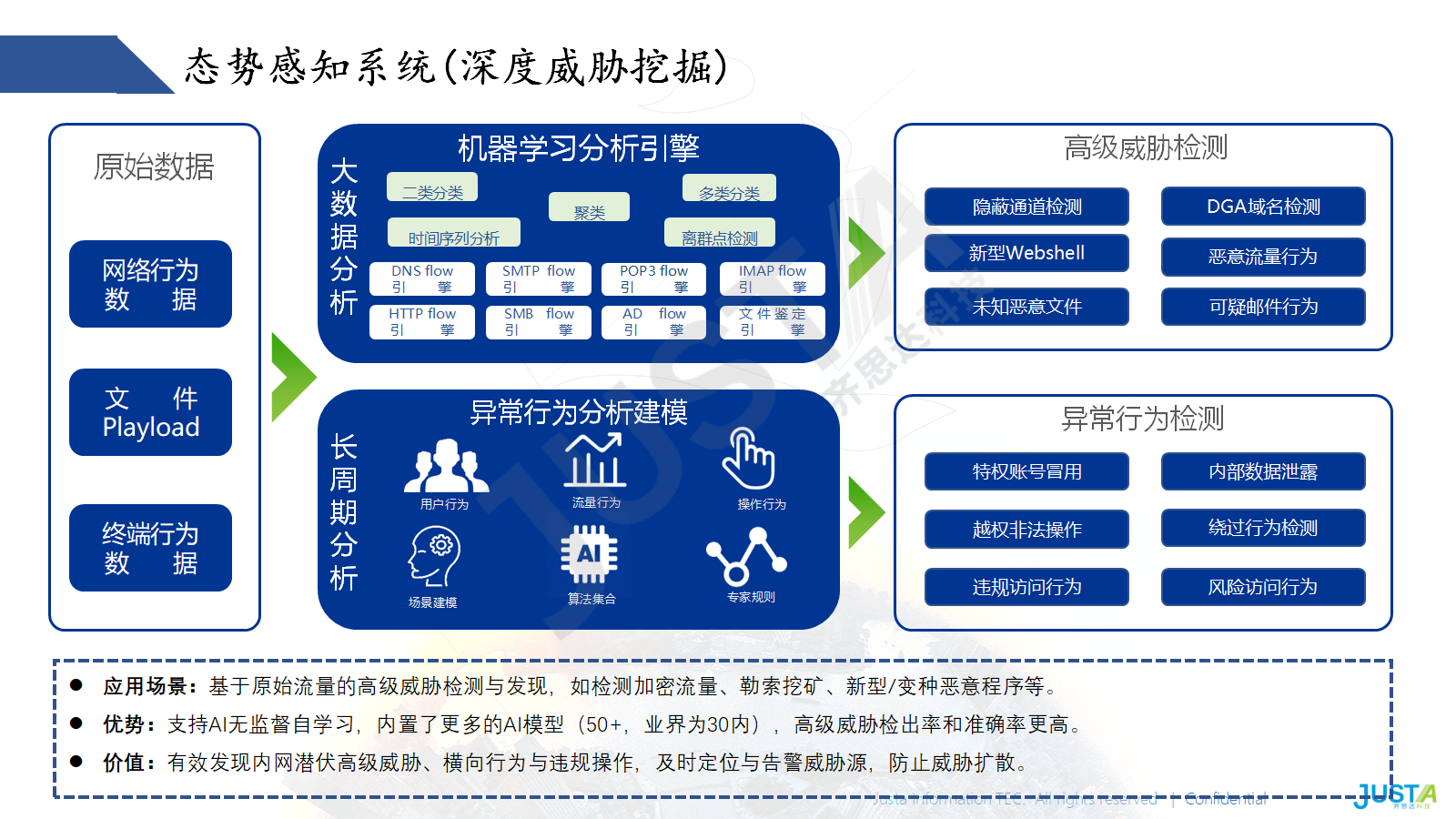 1. 主动防御:通过多维度威胁建模与关联分析,提升对高级威胁(如APT攻击、0day漏洞利用)的检测能力。基于历史数据与威胁情报,预测潜在攻击路径,优化安全策略。