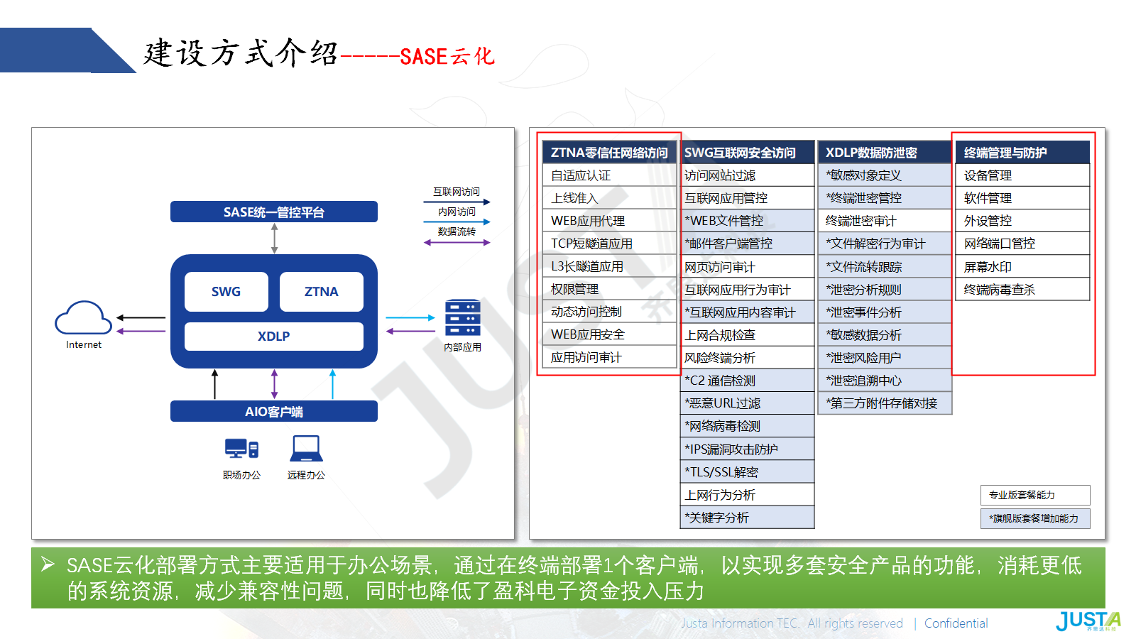 采用SASE(安全访问服务边缘)云化部署方式,通过在终端部署1个客户端,实现多套安全产品的功能。这种方式消耗更低的系统资源,减少兼容性问题,同时降低资金投入压力。