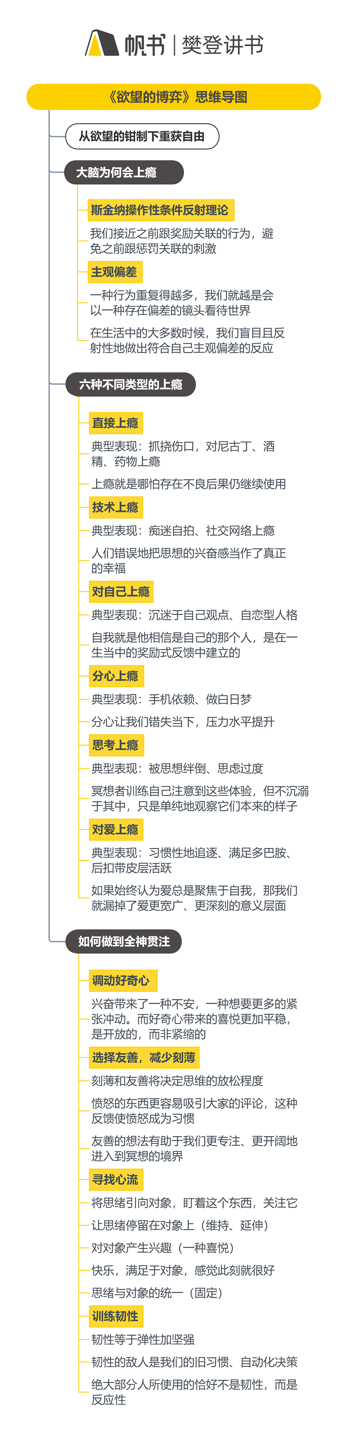 全书分两部分:第一部分解析直接上瘾、技术上瘾等六类行为模式,揭示多巴胺驱动的习惯循环原理;第二部分提出通过正念训练、心流体验等方法打破成瘾机制,强调通过觉察当下体验而非逃避空虚感恢复自我控制。
