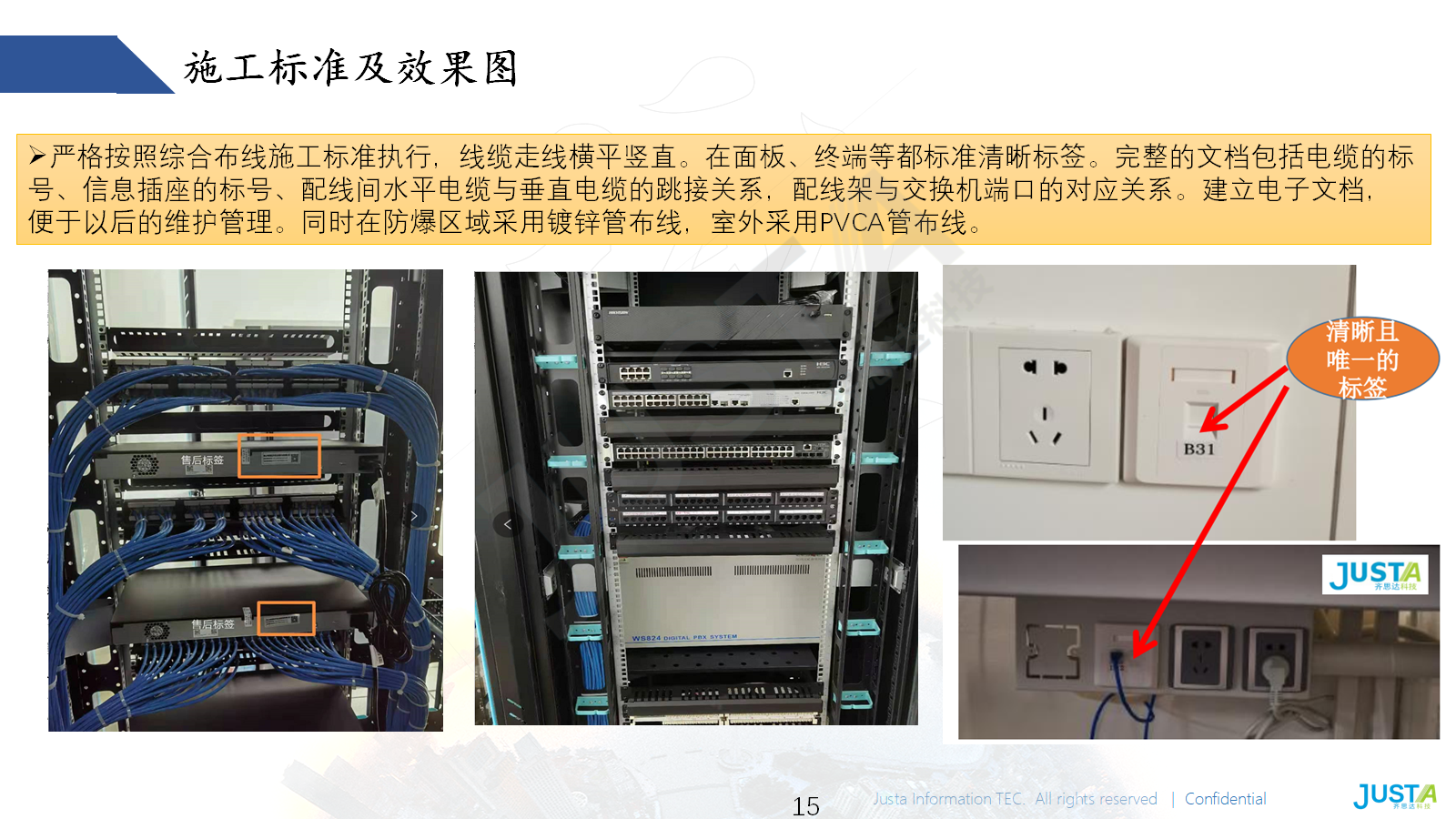 2. 全流程文档化:线缆、终端标注唯一标签,记录设备关联信息并建立电子文档,方便运维与扩容。